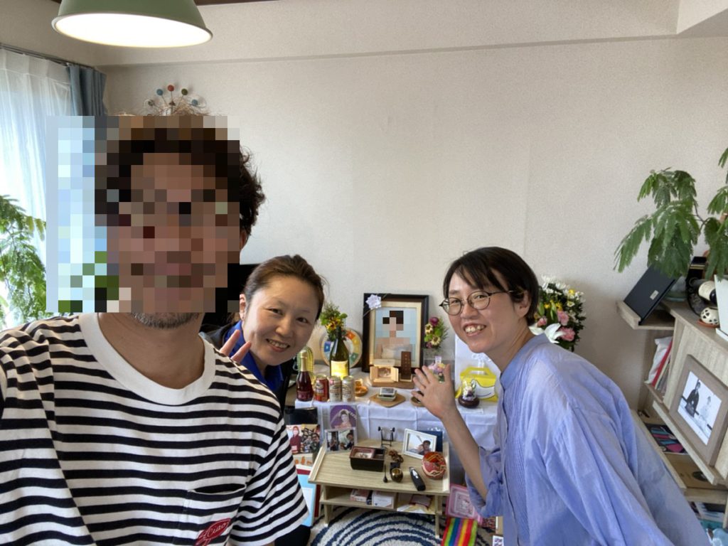 ▲グリーフケアで夫のMさん(左)から「一緒に撮りましょう」と提案いただき記念撮影。中央は黒川店の那須看護師